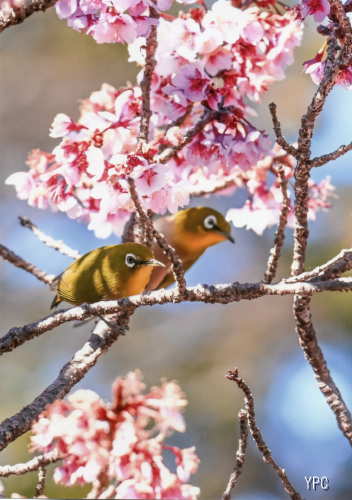 | 田辺市の高台にある長い歴史ある高山寺は早咲きの桜で有名です。毎年厳しい寒さの中年明けから咲き始め一月末頃には満開となるそうです。作者は毎年この時期に花の蜜を求めて枝を忙しなく舞うメジロを望遠レンズで捉えています。明るい日差しの中満開の桜の枝に止まる二羽のメジロ、カップルなのでしょうかなんとも幸せな気持ちになる作品です。 |