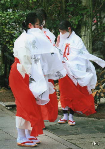 毎年2月8日は針供養の日、使い古された針を収めて裁縫の上達を願う和歌山市加太の淡嶋神社の神事です。今年は約3万本の針が収められ、巫女さんたちがお祓い神事の後針塚まで運び塩をかけて土に返します。行事の後で一瞬の風が巫女さんたちに吹きました。赤い鼻緒の履き物が覗き巫女さんたち神職の気高さと可愛らしさを感じさせる作品となりました。 |