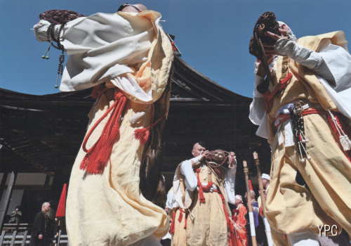 | 高野山に春を呼ぶ「高野の火祭り」は毎年3月の第一日曜日に開催されます。今年は3月1日青天の青空の下金剛峯寺の前の広場で大勢の山伏たちにより護摩木を焚いて招福と厄除けを祈願します。作者は当日青空の下法螺貝を吹き鳴らしながら入場する様子を下から広角レンズで捉えました。山伏たちのそれぞれの動きが生き生きと捉えられ色彩的にもセンスが光る作品となっています。 |