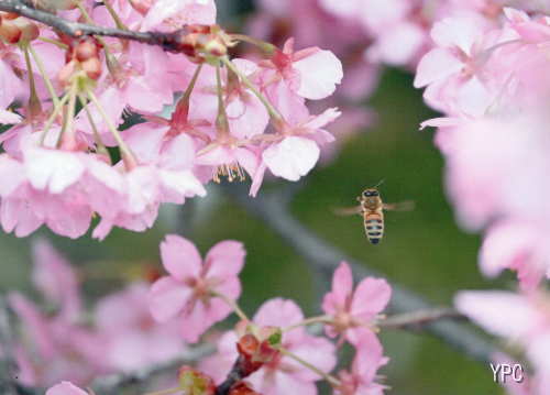 花の季節の始まり、今ヒカンザクラが満開です。花びらを下に向けて咲くこの花の慎ましいけれどピンクの花びらが春の息吹を告げるように咲いています。そこに花の蜜を求めてミツバチが近づいてきます。花と花との絶妙なところに羽を震わせて飛ぶミツバチ、そのピントの良さと絶妙な空間処理がこの作品を格調高くしていると思います。 |