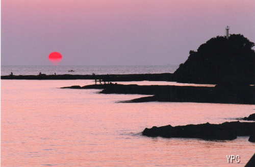 ナショナルトラスト運動の先駆けとなった「天神崎」は田辺湾の北側に位置し海岸自然林の動植物と海の動植物が一体となって同居する貴重な地域です。作者は潮が満ちたその地の夕暮れ、海に落ちる太陽と磯遊びする人たちをシルエットで表現しました。木版画を思わせるおさえた色調の中に夕日の赤がこの作品を拡張高いものとしています。 |