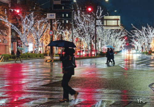昨年の暮れ和歌山駅前から和歌山城市駅前にかけてのイルミネーションは毎年スケールアップしてきました。作者は雨の夕暮れ撮影に臨みました。濡れた車道がイルミネーションと信号の赤が画面にアクセントをつけます。横断歩道を渡る奥のカップルの青い傘が小さいながら画面の中のポイントとなって引き締めています。 |